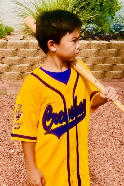 Baseball Jersey (100% polyester) with *2-Color Tackle twill Crenshaw swoosh logo on front, 4×4