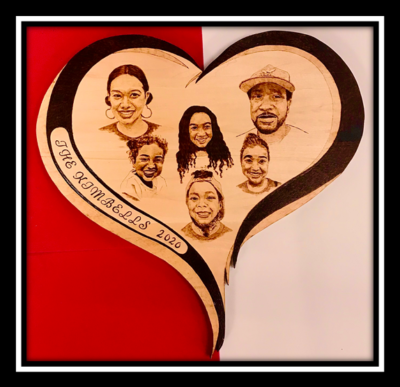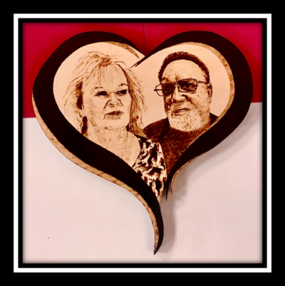 20”x 20”x¾” Basswood Pyrograph Heart Plaque with original hand-burned custom images (limited to 6 people) by J. Williams. Great gift idea for weddings, Valentine’s Day, graduations, birthdays, anniversaries, and celebrations of life Price: $325. Clock Option: $25