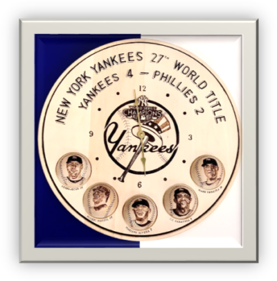 18”x ¾” circular Basswood Original Pyrograph New York Yankees 27th World Championship Title Clock. It features images on wooden baseballs of the Top 5 Players on the 2009 World Championship Team. J. Williams will hand burn a custom World Championship Clock honoring your favorite team, featuring your Top 5 favorite Players from that team. The baseballs may be substituted for wooden basketballs, volleyballs, or soccer balls Price: $229 Custom Orders allow 3-6 weeks for delivery after submitted reference artwork or photos are approved. (TO PLACE AN ORDER PLEASE CALL OUR DIRECT LINE 310-739-1964 ask for Bill Smith)