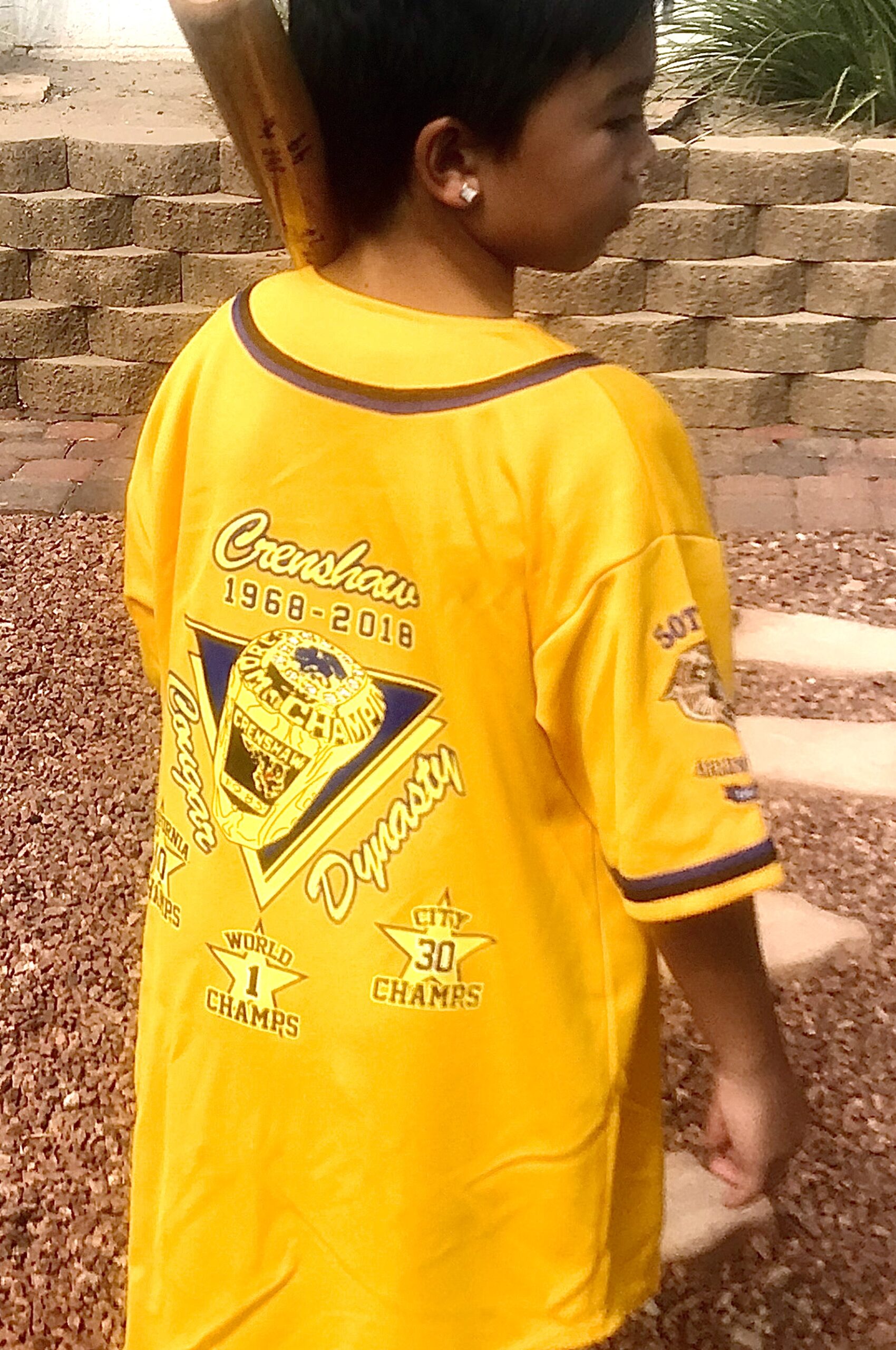 Baseball Jersey (100% polyester) with *2-Color Tackle twill Crenshaw swoosh logo on front, 4×4