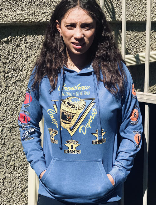 6-8oz Fleece Hoodie Sweatshirt w/50th Anniversary Logo on the front and 41 City & 10 State Championship Logos on the R&L sleeves