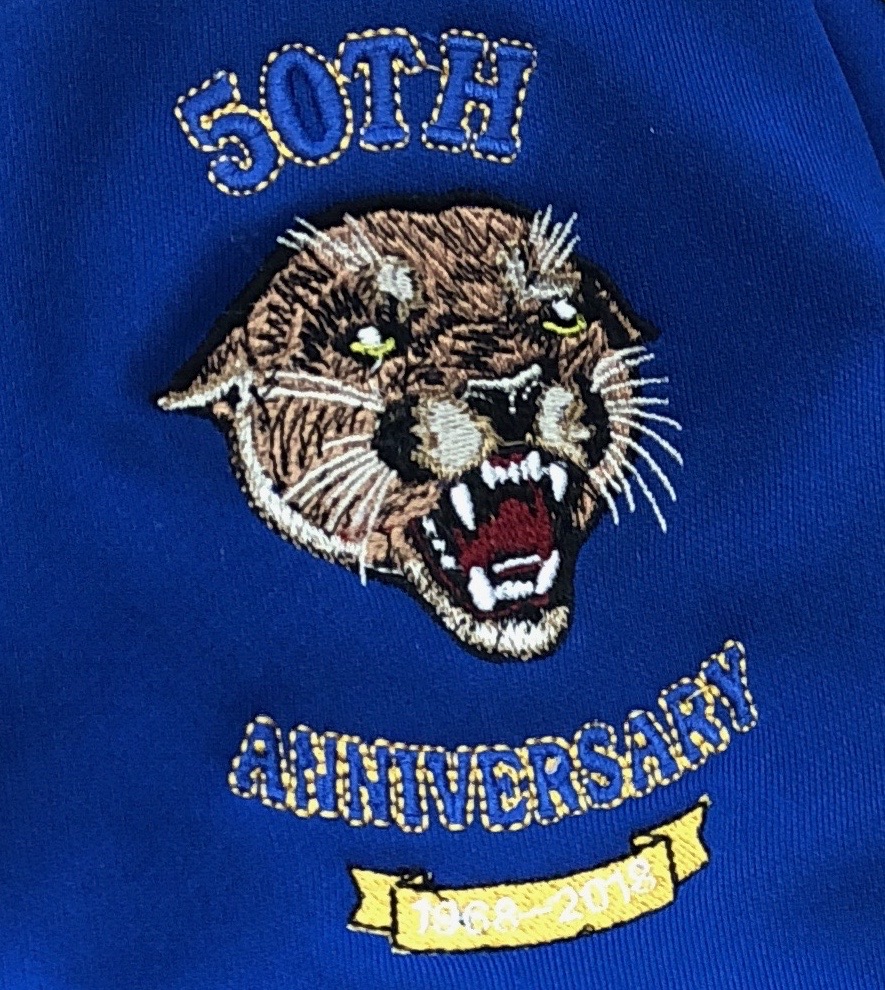 on the front, small cougar head embroidered Logo on Right sleeve and Large