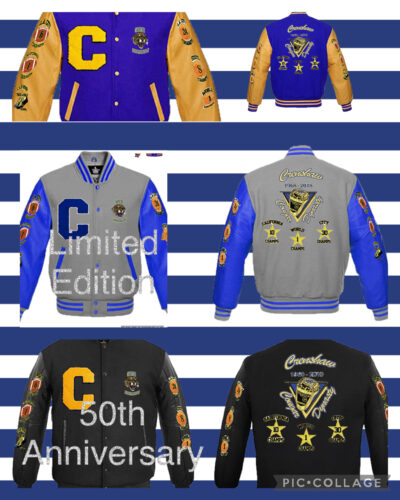 Size XL ONLY-The Back & Front of the Jacket displays a Large oversized Logo & small 4 x 4 pocket 50th Anniversary logo. “The Dynasty Limited Edition Jacket” logos display the 30 LA City Championships,10California State Championships, & 1 World Championship Title won by Crenshaw Basketball, Football &Track & Field from 1968-2018. Two of the 6 sleeve patches offered are free (You choose which 2 you want on the sleeves) It also includes a Free Varsity C Chenille Letter. (You must choose a Royal or Gold C Letter for your Jacket) The other 4 patches are optional and require a fee for each.